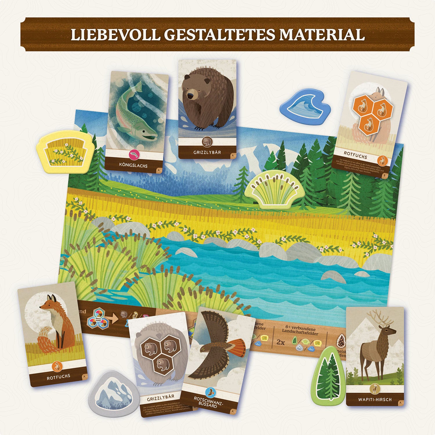 Hirsche, Füchse, Bussarde, Lachse, Bären: viele Wildtiere leben in Cascadia. Ihre Heimat soll noch schöner und größer werden! Um den Lebensraum weiter auszubauen und zu gestalten, werden passende Wildnisplättchen ausgesucht und an der richtigen Stelle angelegt. Liegen drei gleiche Tiersymbole nebeneinander, können die Tiere in die eigene Landschaft der Spielerin oder des Spielers umziehen. Wer sammelt so die meisten Punkte? Und wer schafft es, drei gleiche Lebensräume nebeneinander zu platzieren? Das „Spiel des Jahres“ 2022 jetzt auch für Kinder und Familien ab sechs Jahren. Ein abwechslungsreiches und wunderschön gestaltetes Legespiel für Natur- und Tierfans.