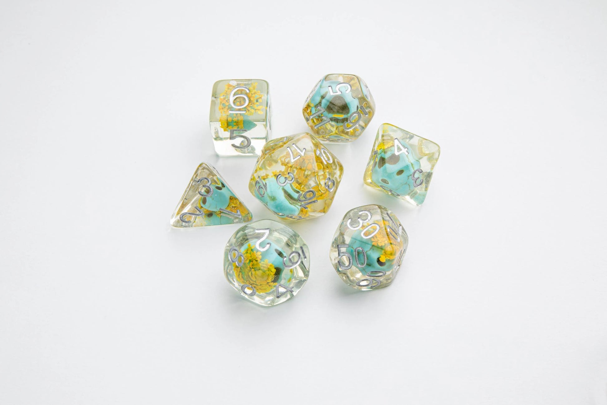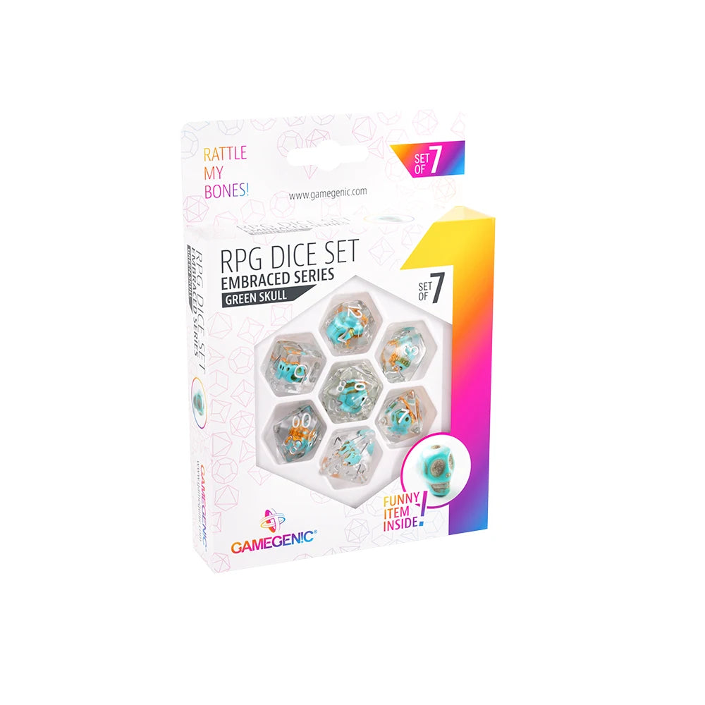 Wähle deine Waffe! Dieses Würfelset enthält einen D4, einen D6, einen D8, zwei D10 (10 und 00), einen D12 und einen D20. Alle Würfel haben abgerundetete Ecken und sind hochwertig verarbeitet. Die Embraced-Würfel haben einen interessanten Gegenstand im Inneren und machen jeden Spieleabend zu einem kritischen Treffer. Die Würfel sind in einem Fensterkarton verpackt und zeigen auf der Vorderseite alle Würfel auf einen Blick.