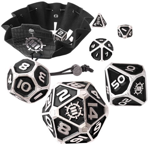 NHANCE Tabletop Collectors Edition 7pc Metal RPG Dice Set COLLECTORS EDITION 7PC METAL DICE SET: Includes D20, D12, D10, D8, D6, D4, and D% (percentile) for a complete metal dice set ready for TTRPGs like D&D, Call of Cthulhu, Savage Worlds, Cyberpunk, mor. 2-IN-1 CONVERTIBLE DICE BAG & TRAY: The Dragon Satchel (Vegan leather) transforms from a gorgeous drawstring dice bag to an unfolded dice arena so you can safely roll metal dice on any surface. HEAVY DUTY METAL GAME DICE: Crafted out of hefty metal alloy with molded numbers that will outlast the toughest dungeon battles during each roll of fate (not stickers that peel like on other dice). MATCH YOUR DRAGON HIDE GEAR: The Collector's Edition dice feature a gunmetal grey finish and come in multiple color options to coordinate with ENHANCE Tabletop Collector's Edition bags and cases. FORTIFY YOUR ODDS: Easy-to-read numbers keep gameplay going.