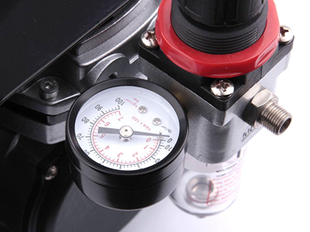 Die Ansaugleistung ist mit knapp 23 Liter pro Minute beachtlich. Dank des Druckreglers kannst du den Arbeitsdruck stufenlos einstellen und auch der Wasserabscheider arbeitet zuverlässig. Darüber hinaus verfügt der Mini Airbrush Kompressor auch über einen Überhitzungsschutz und eine Abschaltautomatik.