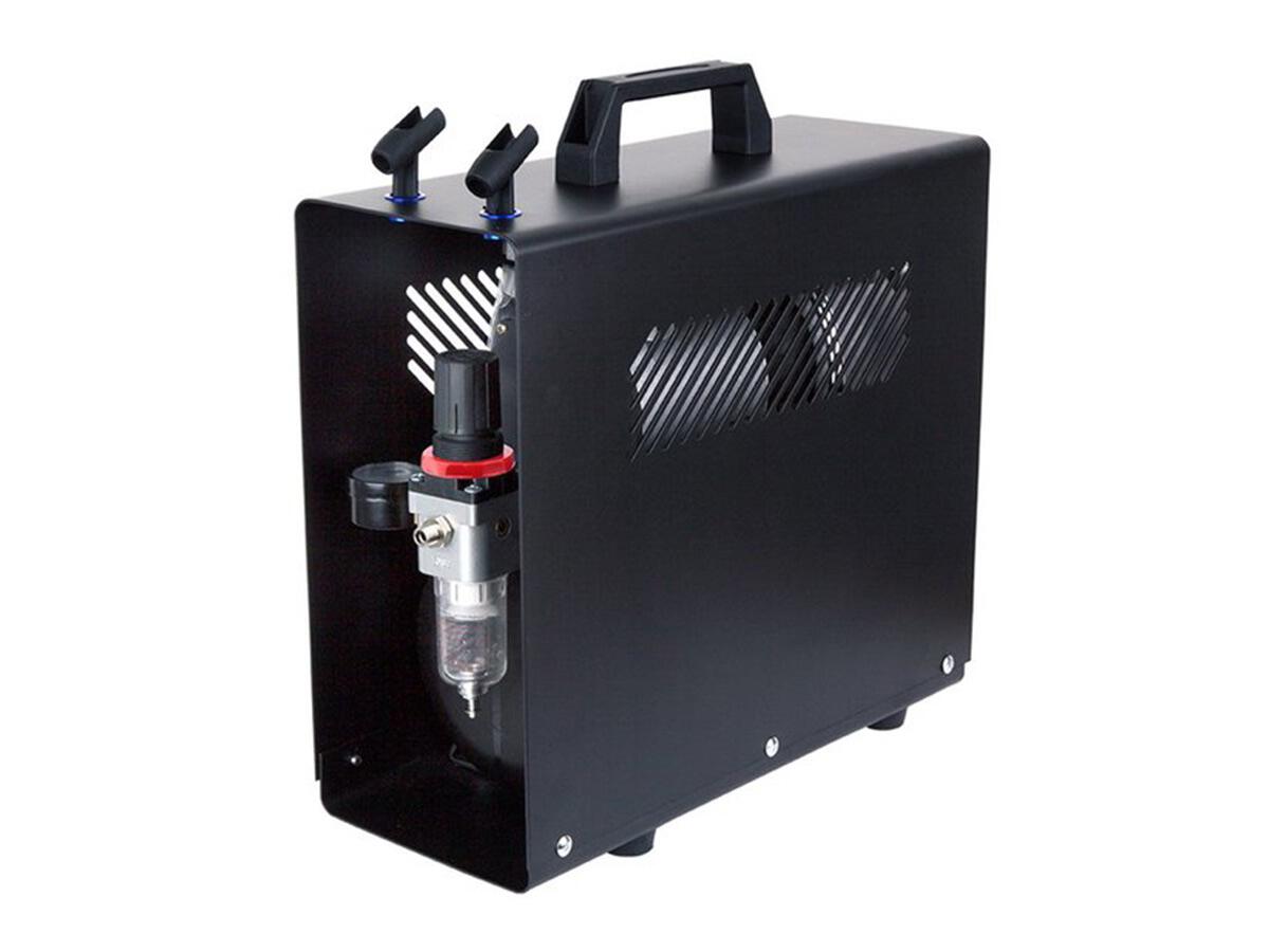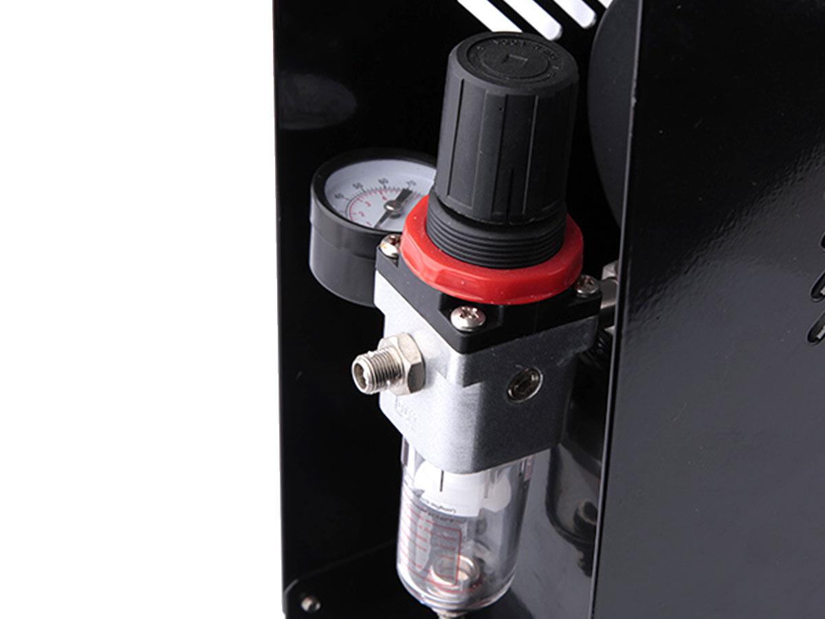 Der FD 196 A ist ein preiswerter Doppelkolbenkompressor vom chinesischen Hersteller Fengda. Er erzeugt durch den Einsatz von zwei Kolben einen maximalen Druck von satten 6 bar und eignet sich somit für Airbrushpistolen mit Düsengrößen bis zu 0,6 mm. Den Druck kannst du dir also von 0 - 6 bar, stufenlos und schnell am Kompressor einstellen. Natürlich hat auch der FD 196 A einen Wasserabscheider und ein Manometer.