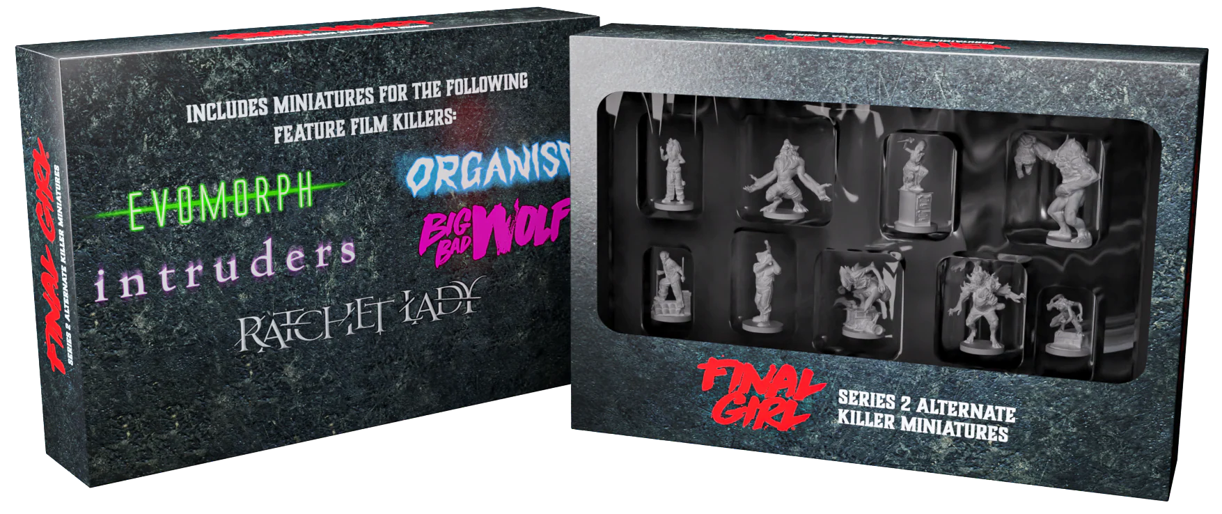 9 alternate miniatures for each of the killers from Series 2. Big Bad Wolf, Bag Head, Evomorph, Zeke, Strong, Trish, Tough, Ratchet Lady and Fast.