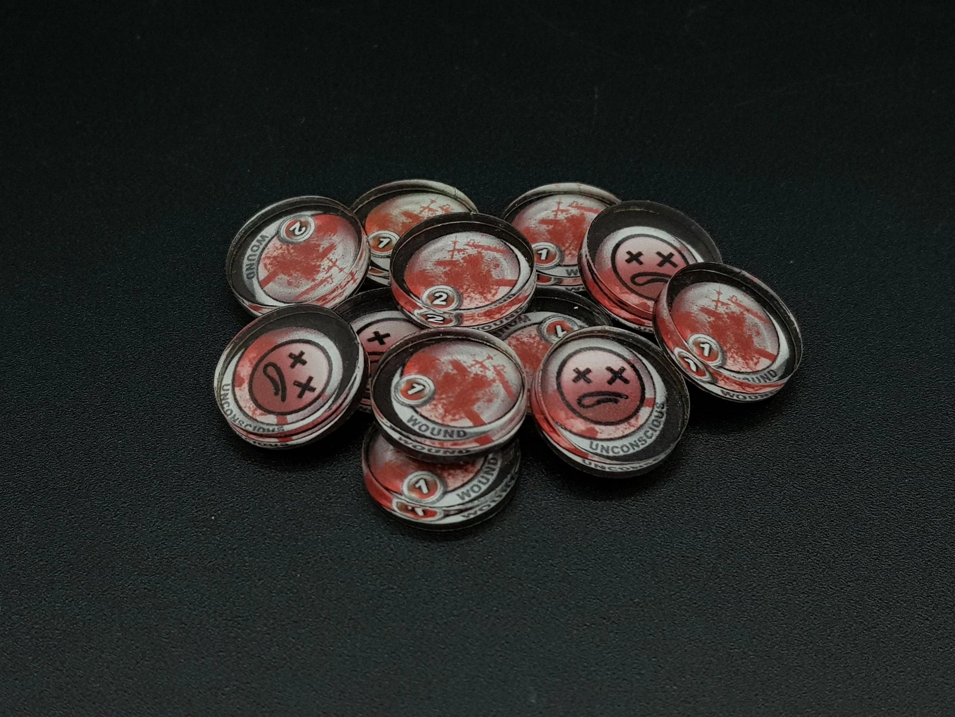 - A set of 12, 15mm tokens made of a transparent 3mm acrylic.
