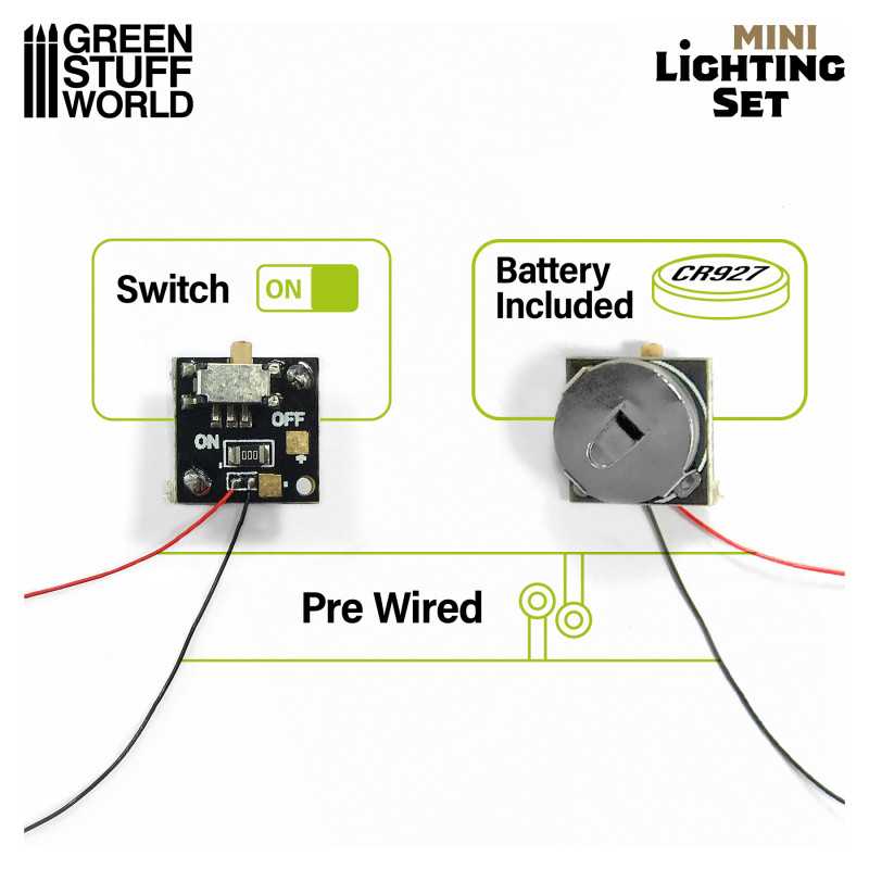 Vormontiertes Mini-Beleuchtungsset mit Schalter und Verkabelung, mit dem Sie Ihre Miniaturen und Dioramen beleuchten und ausschalten können, ohne Lötmittel verwenden zu müssen. Dieses Set funktioniert mit einer mitgelieferten CR927 (3V) -Tastenbatterie.