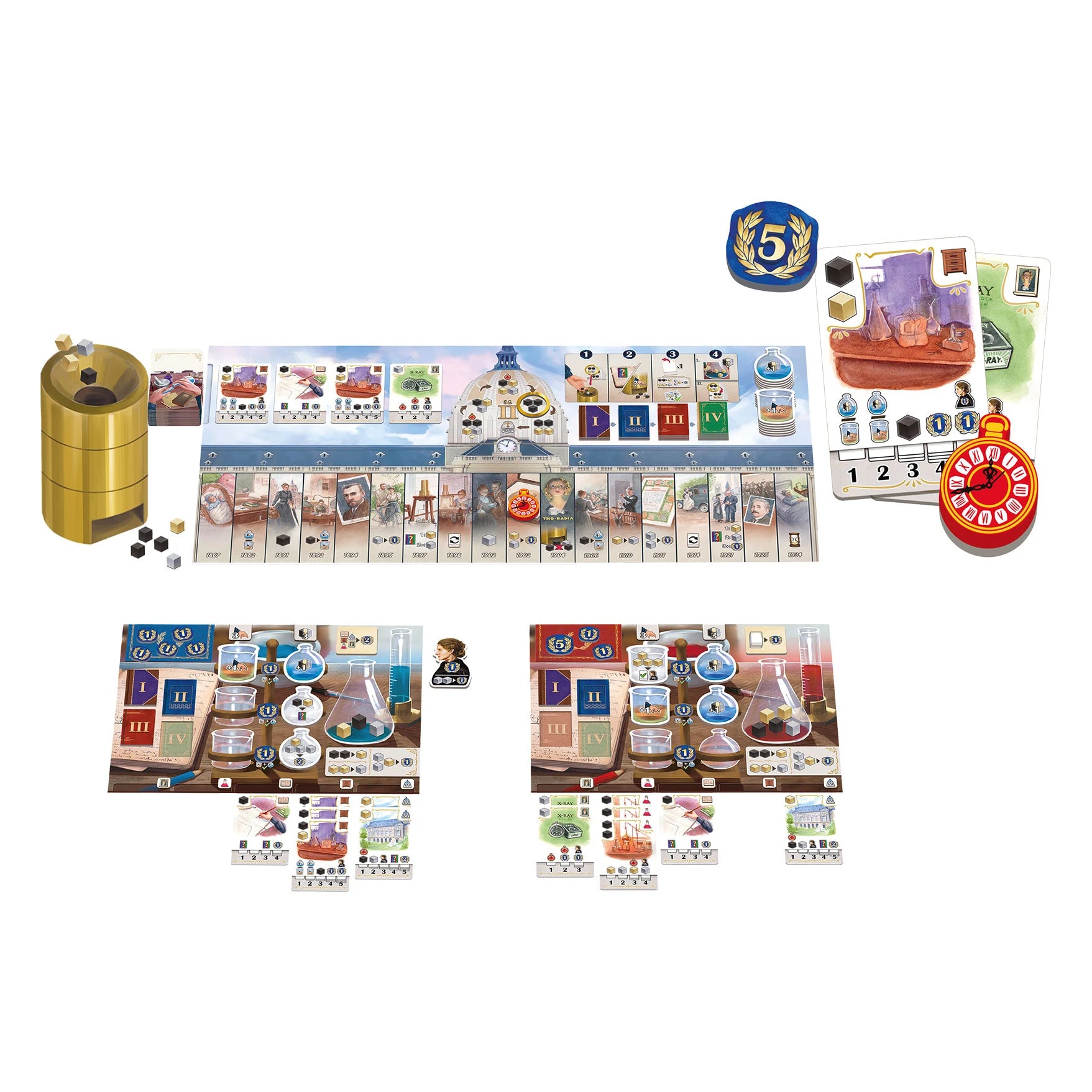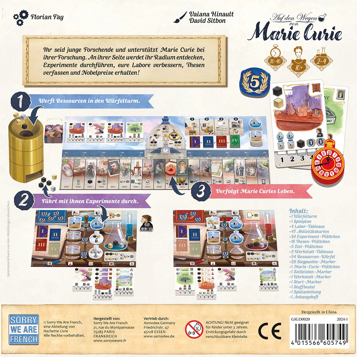 In Auf den Wegen von Marie Curie schlüpft ihr in die Rolle von Forschenden, die Marie Curie bei ihren Experimenten unterstützen. Mithilfe einfacher und eleganter Ressourcenmanagement-Mechanismen sammelt ihr Uran, Radium und Pechblende, verbessert eure Labore und verfasst wissenschaftliche Thesen. Die Zeitleiste des Spielplans stellt das Leben der berühmten Physikerin und Chemikerin mit allen Meilensteinen dar und sorgt für ein dynamisches Gameplay. Der raffinierte Würfelturm erschafft viele Spannungsmomente und unterstreicht die experimentelle Thematik des Spiels. Wer von euch wird sich durchsetzen und die Gunst von Marie Curie erringen?