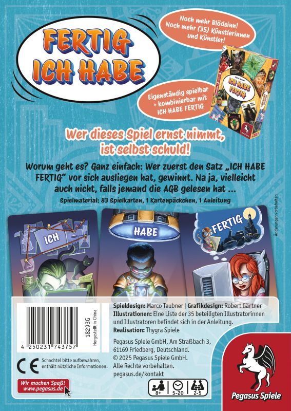 Das Spielprinzip ist leicht erklärt: Wer am Zug ist, darf entweder eine Karte vom Nachziehstapel auf die Hand nehmen oder eine Handkarte ausspielen und tun, was die Karte verlangt. Gespielt wird im Uhrzeigersinn und wer gewinnen will, muss als erstes die drei Zielkarten „FERTIG“, „ICH“ und „HABE“ vor sich ausliegen haben. Aber die Spielanleitung gilt hier eher als Richtlinie: Was passiert, entscheiden die chaotischen Karten. Zum Beispiel sorgt das „Müllrad“ dafür, dass der Ablagestapel in den Nachziehstapel gemischt wird und zwei Karten nachgezogen werden. Oder es folgt eine „Überraschung“, ein „Befehl von ganz, ganz oben“ oder „Schrödingers Albtraum“, was das Spiel ganz schön aufmischen kann … 83 neue Spielkarten, illustriert von 35 Künstler*innen sorgen für noch mehr Wendungen und noch mehr Blödsinn.