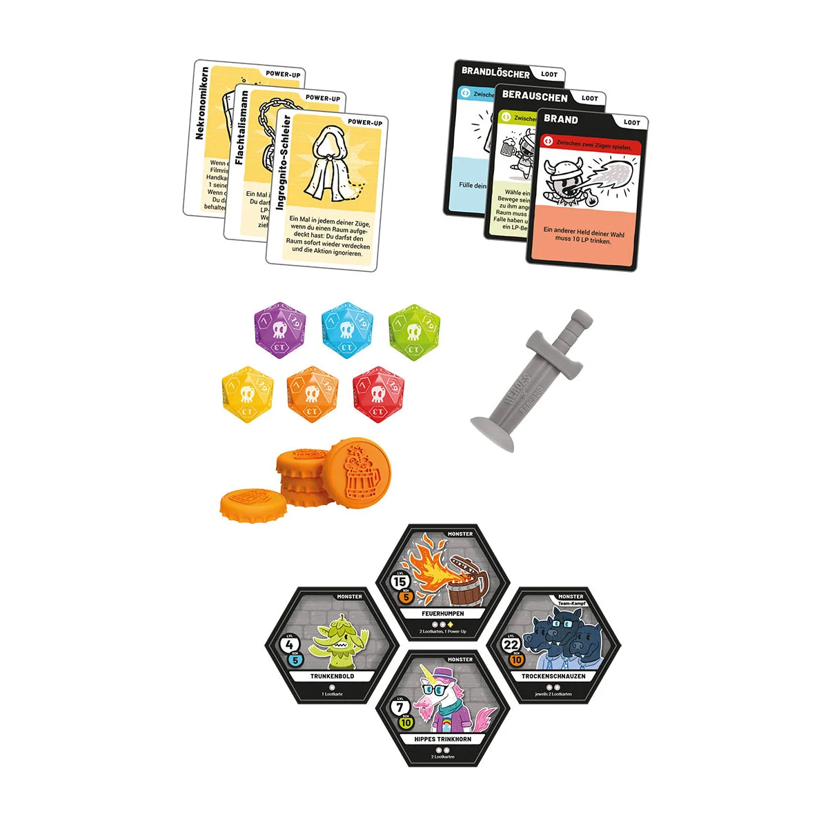 Heroes of Barcadia ist ein Partyspiel für Erwachsene, bei dem ihr als tollkühne Helden zu einem Trinkwettbewerb antretet und nach dem meisten Ru(h)m greift. Eure Trinklaune wird dabei allerdings von einer Horde Monster getrübt, die ihr im variabel aufgebauten Dungeon bekämpfen müsst. Eure Becher (mit Inhalt eurer Wahl) stellen hierbei eure Heldenfiguren und ihre Lebenspunkte dar. Wenn ihr welche verliert, müsst ihr trinken! Dabei solltet ihr euren Mitstreitern nicht zu sehr vertrauen, denn sie werden die erste Chance nutzen, euch tief ins Glas schauen zu lassen. Beweist, was ihr draufhabt, und findet den „Suffhort“ bevor es die anderen tun, in diesem schnellen und feuchtfröhlichen Partyspiel für Fantasyfans mit großem Durst.