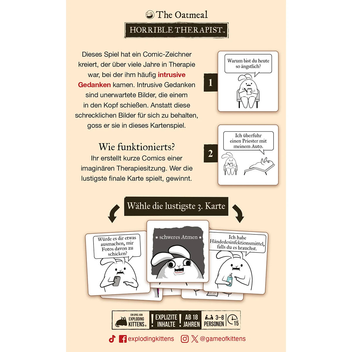 Dieses Spiel hat der Comic-Zeichner The Oatmeal kreiert, der über viele Jahre in Therapie war, bei der ihm häufig intrusive Gedanken kamen. Intrusive Gedanken sind unerwartete Bilder, die einem in den Kopf schießen. Anstatt diese schrecklich makaberen und witzigen Bilder für sich zu behalten, goss er sie in dieses Kartenspiel ...