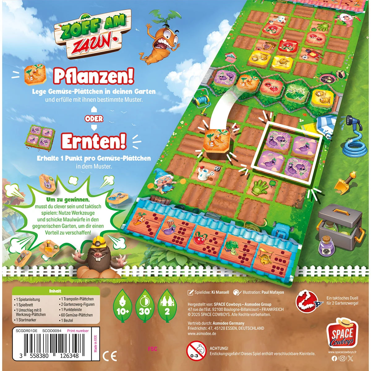 - In dem 2-Spieler-Spiel Zoff am Zaun musst du clever sein und taktisch spielen. Pflanzt Gemüse in euren Garten. Dabei müssen sie bestimmte Muster bilden. Nur dann könnt ihr sie ernten, um Punkte zu bekommen. Nutzt Werkzeuge, um das Beste aus eurem Garten herauszuholen – oder euer Gegenüber zu ärgern. Wer am Ende die meisten Punkte hat, gewinnt